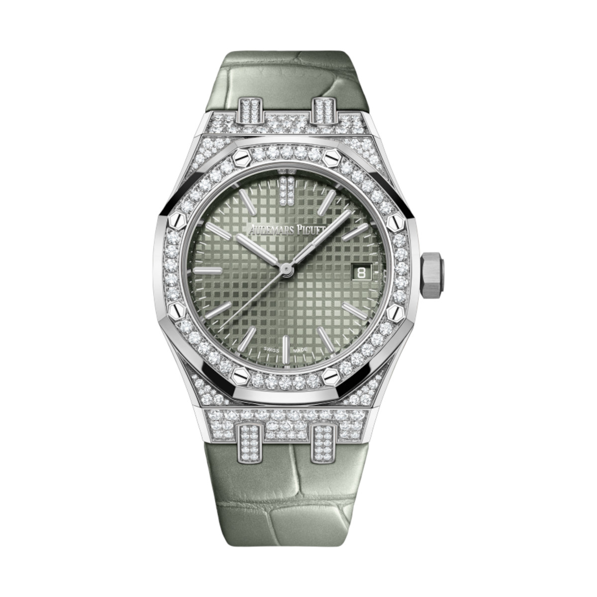 Audemars Piguet 15551BC.ZZ.D405CR.01 Royal Oak Green with “Grande Tapisserie” Pattern 37mm Dial Pearly Green Alligator Strap
