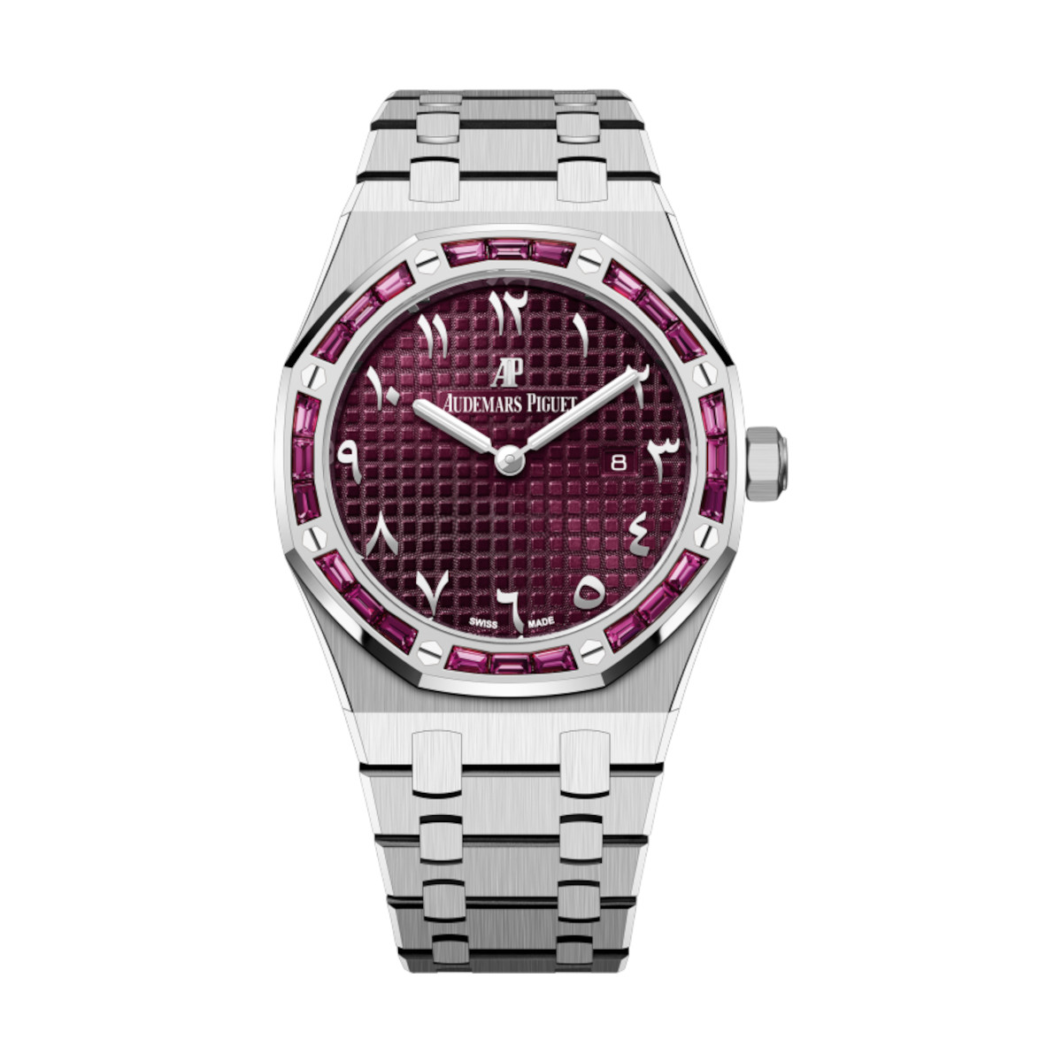 | Dial Material: | Burgundy dial with “Grande Tapisserie” pattern, white gold applied eastern Arabic numeral hour-markers and Royal Oak hands with luminescent coating |