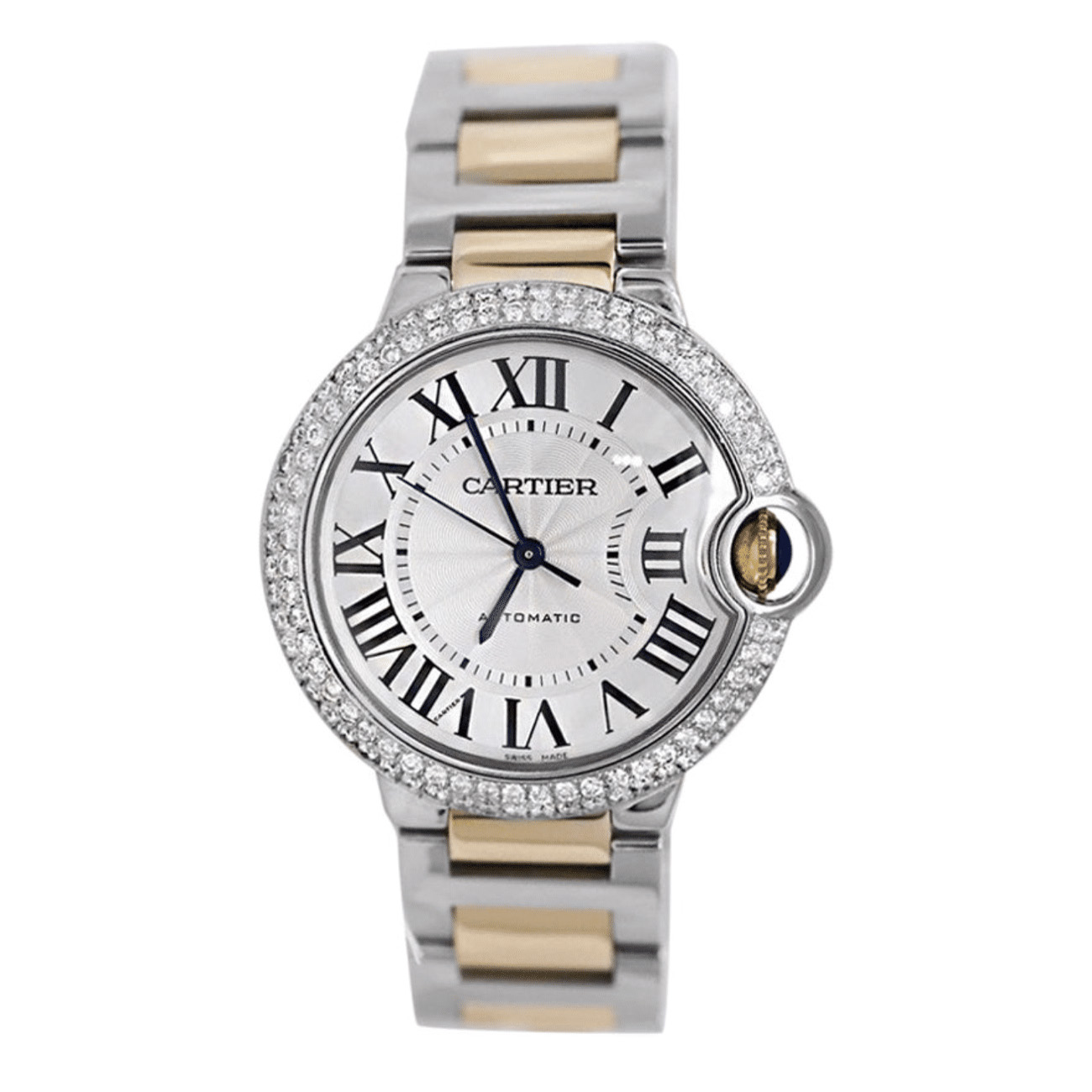 Experience Parisian elegance with the Cartier Ballon Bleu W6920047, a 36mm unisex timepiece blending stainless steel and 18K yellow gold in a sophisticated two-tone design. This automatic watch features a refined silver dial with Roman numeral markers and distinctive blue steel hands, protected by scratch-resistant sapphire crystal. The custom diamond-set bezel adds luxurious brilliance, while the steel and gold bracelet with double-locking clasp ensures secure wear. Presented in excellent used condition with original box and manuals, this Swiss-made watch includes a 1-year mechanical warranty and lifetime diamond replacement coverage, having been professionally polished and serviced to near-new standards.