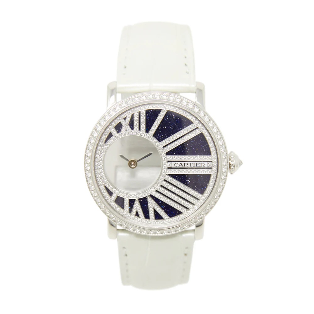 The Cartier Rotonde collection exemplifies the maison’s commitment to blending horological precision with jewelry artistry. This 2018 model showcases Cartier’s signature design language through its elegant 35mm white gold case, where every element reflects Parisian sophistication. The blue aventurine dial creates a celestial backdrop for the diamond-set Roman numerals, a hallmark of Cartier’s aesthetic mastery. The diamond-adorned bezel and crown demonstrate the brand’s jewelry heritage, while the automatic movement ensures reliable timekeeping. Originally presented in 2018, this timepiece represents a modern interpretation of Cartier’s classic design principles. Ideal for formal occasions, evening events, or as a statement piece for the discerning collector, the Rotonde HPI01197 embodies the perfect balance between technical watchmaking and artistic expression, making it a versatile companion for the sophisticated woman who appreciates both craftsmanship and aesthetic refinement.