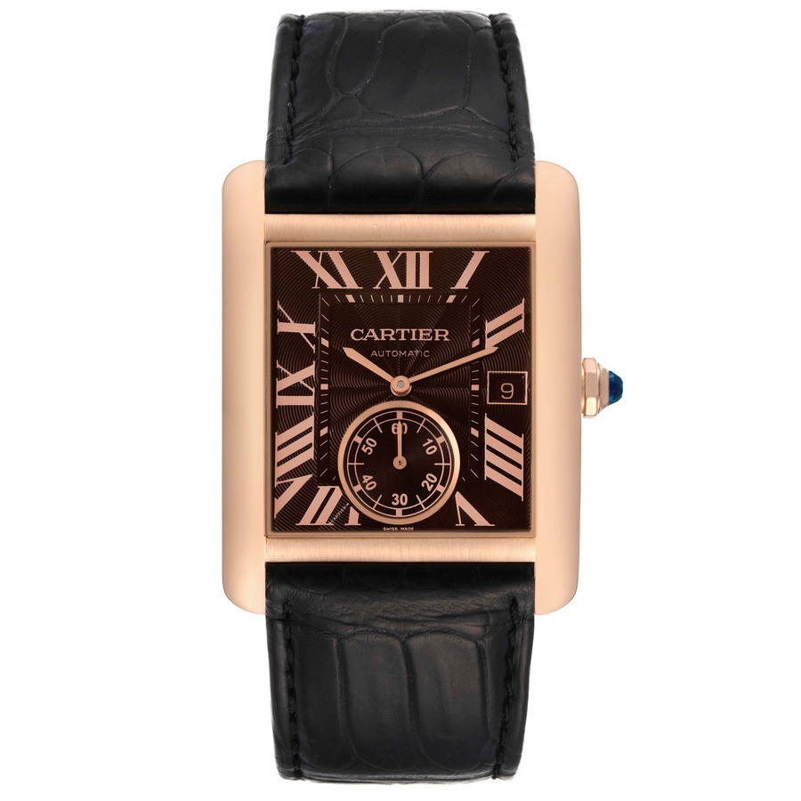 Experience Parisian elegance with the Cartier Tank W5330002, featuring a refined 34mm rectangular case crafted from 18kt rose gold. This sophisticated timepiece showcases a rich brown dial adorned with classic Roman numeral markers and rose gold hands, creating a timeless aesthetic. Powered by an automatic mechanical movement with date complication and small seconds sub-dial at 6 o’clock, it offers reliable precision with a 48-hour power reserve. The luxurious brown alligator leather strap with deployant clasp ensures comfortable wear, while scratch-resistant sapphire crystal protects the elegant display. Complete with original box and papers, this Swiss-made masterpiece represents Cartier’s enduring legacy of jewelry-inspired watchmaking excellence.