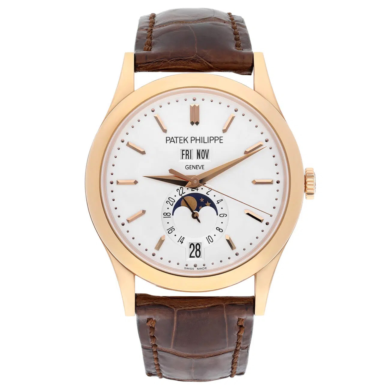 The Patek Philippe Annual Calendar reference 5396R-011 represents the pinnacle of horological refinement, featuring a 38.5mm 18k rose gold case with elegant silver dial. This sophisticated timepiece displays the complete calendar with date, day, month, and moon phase complications, requiring adjustment only once per year. Powered by an automatic movement protected by scratch-resistant sapphire crystal, the watch maintains Patek Philippe’s legendary precision. Presented in excellent used condition from 2011, this exceptional piece includes original box and papers, accompanied by a genuine leather strap that complements its timeless aesthetic. A true heirloom-quality watch from the Grand Complications collection.