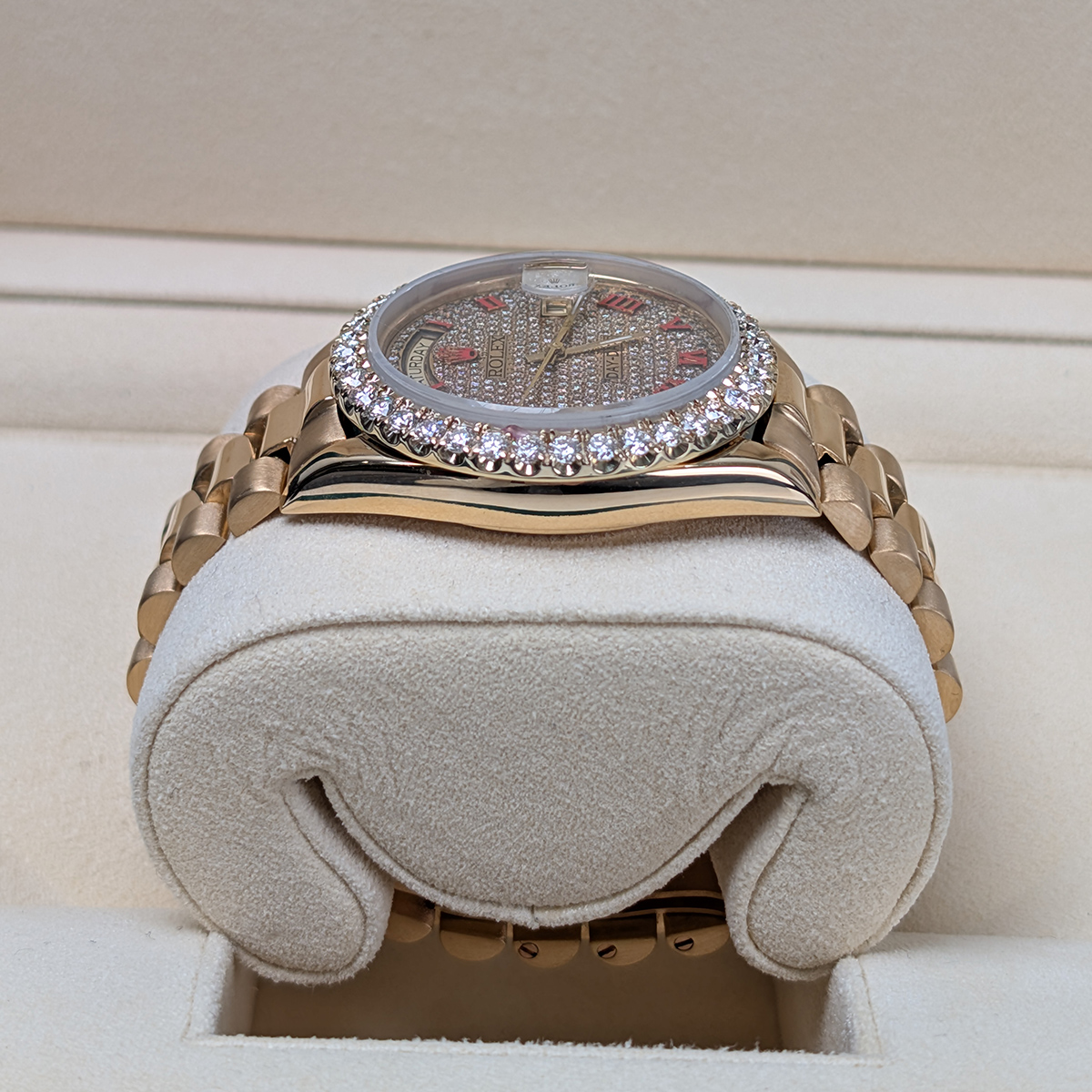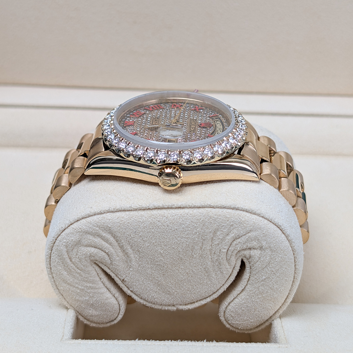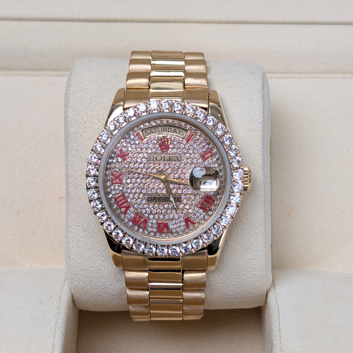 Rolex 36mm 18038 Day-Date Aftermarket Iced Out Dial and Bezel Watch, 2-year warranty with Luxury Watches USA and Rolex Box