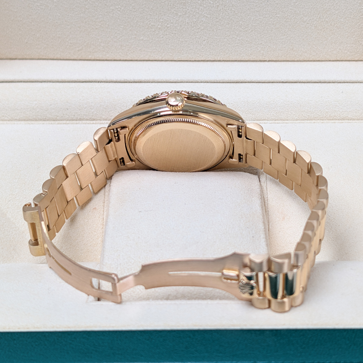 18kt yellow gold case with a 18kt yellow gold president bracelet. Aftermarket Diamond bezel. Aftermarket Iced Out Dial. Date display at the 3 o’clock position. Not Waterproof.