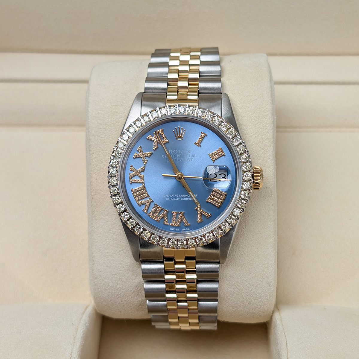 Rolex Datejust 16013 Aftermarket Diamond Bezel and Aftermarket Blue Dial, Aftermarket Bracelet 36mm Watch, 2-year warranty with Luxury Watches USA and Rolex Box