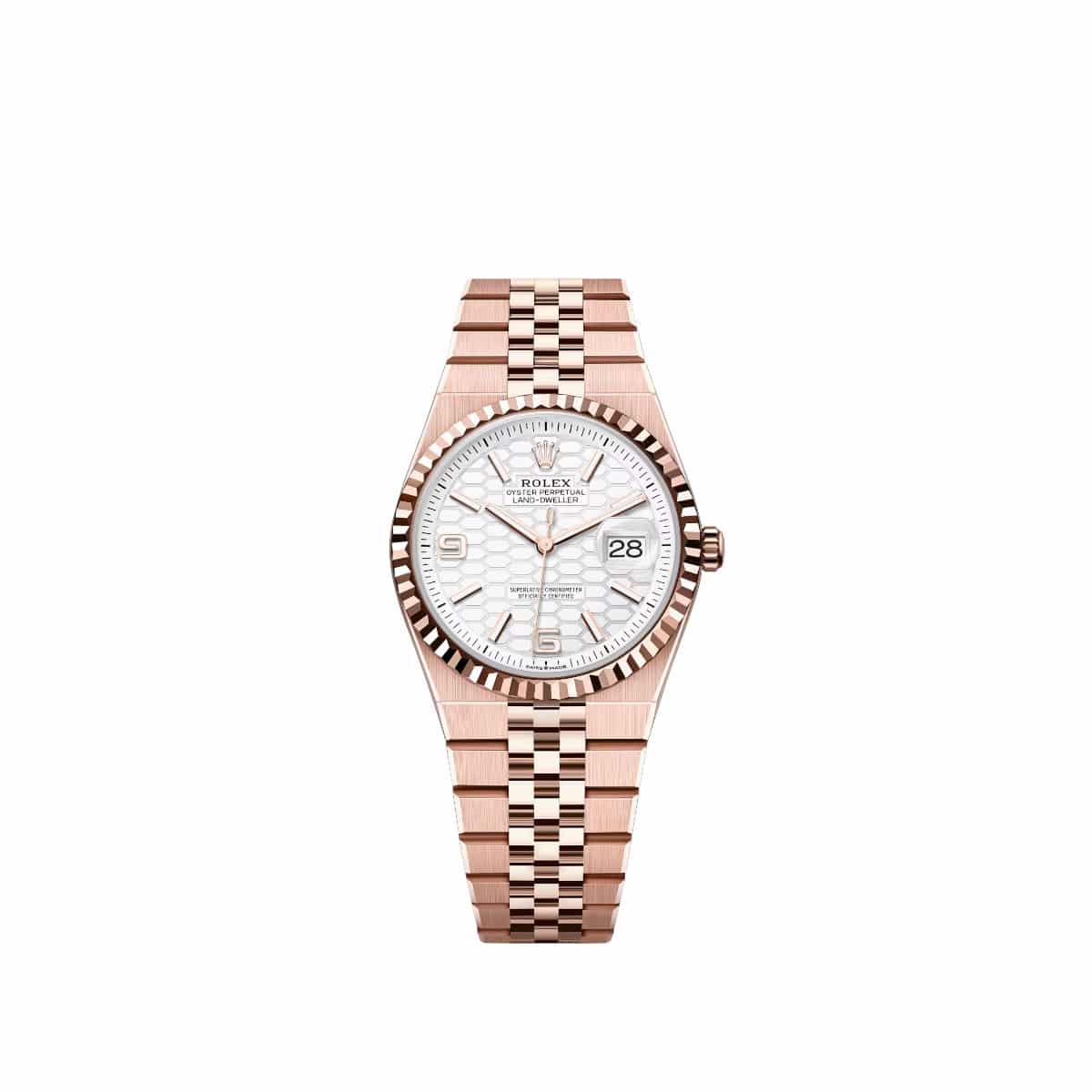 Rolex Land-Dweller 127235-0001 36mm White Honeycomb Dial Fluted Bezel Everose Gold Jubilee Bracelet Watch